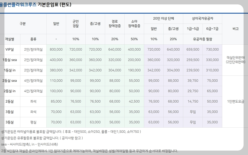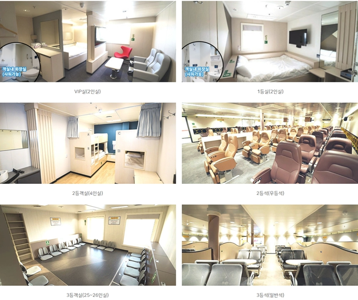 VIP실, 2인용 1등실,4인실 2등 객실, 우등석 2등 좌석,