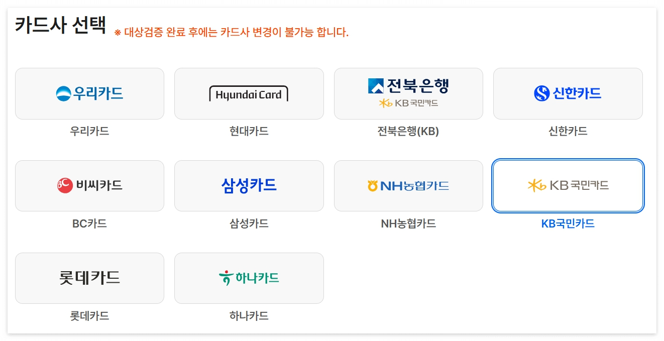 ※ 카드 등록 후 카드사 변경 불가하므로 신중하게 선택하세요.